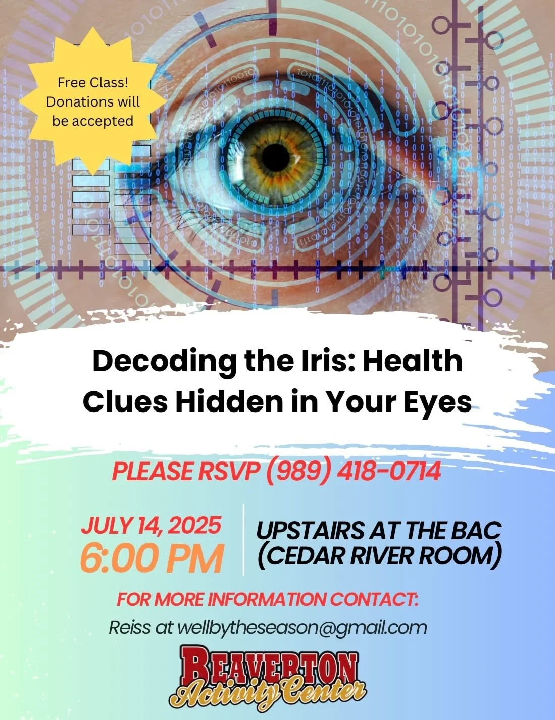 Join us for a fascinating class on how your eyes reveal hidden truths about your health. Learn the basics of iridology and discover how to support your body based on basic markers. Iris photos available for consult clients!